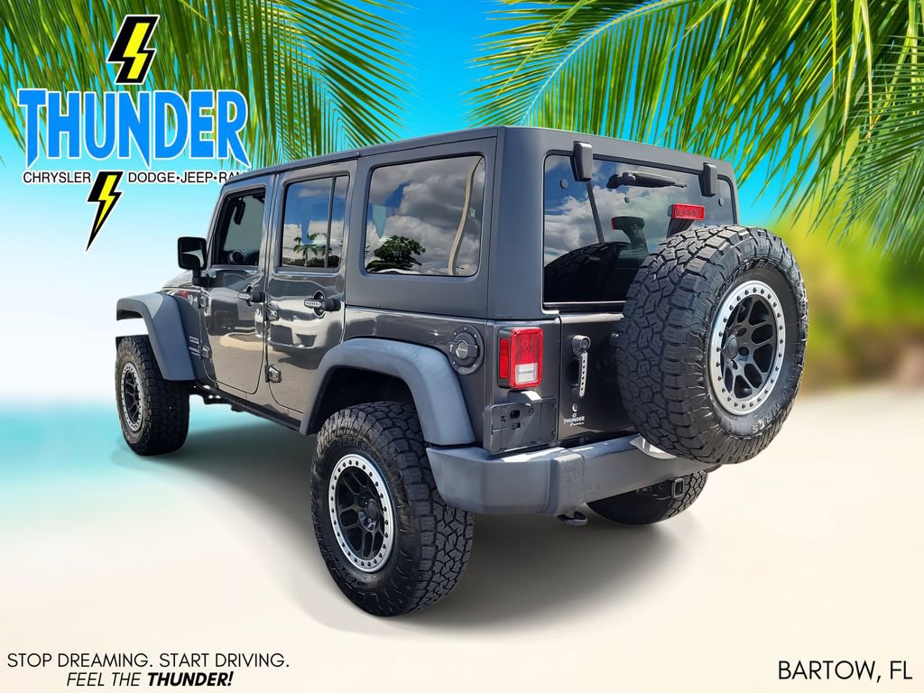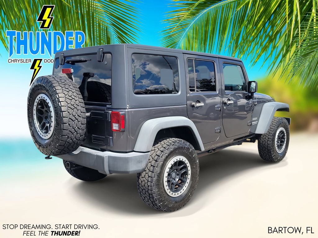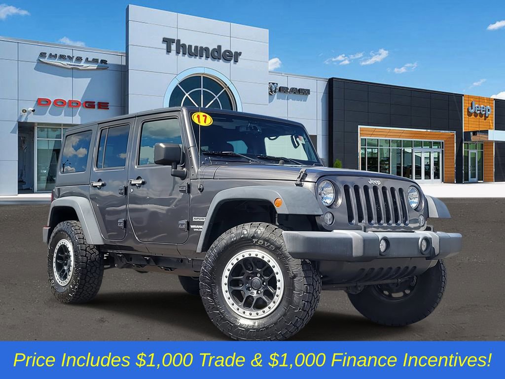 * 2017 KBB.com 10 Most Awarded Brands Connectivity Group (Remote USB Port, Tire Pressure Monitoring Display, Uconnect Voice Command w/Bluetooth, and Vehicle Information Center), Max Tow Package (Class II Receiver Hitch and Trailer Tow w/4-Pin Connector Wiring), Quick Order Package 24S (17" x 7.5" Aluminum Wheels, Auto-Dimming Mirror w/Reading Lamp, Deep Tint Sunscreen Windows, Front 1-Touch Down Power Windows, Leather Wrapped Steering Wheel, Power Convenience Group, Power Heated Mirrors, Power Locks, Remote Keyless Entry, Security Alarm, and Chrome/Leather Wrapped Shift Knob), Wrangler Unlimited Sport, 4D Sport Utility, 3.6L V6 24V VVT, 5-Speed Automatic, 4WD, Granite Crystal Metallic Clearcoat, Black Cloth, 1-Yr SiriusXM Radio Service, 16" x 7.0" Luxury Styled Steel Wheels, 4-Wheel Disc Brakes, 8 Speakers, ABS brakes, Air Conditioning, AM/FM radio, Anti-Spin Differential Rear Axle, Black 3-Piece Hard Top, Brake assist, CD player, Cloth Seats w/Adjustable Head Restraints, Compass, Delete Sunrider Soft Top, Driver door bin, Driver vanity mirror, Dual front impact airbags, Electronic Stability Control, Freedom Panel Storage Bag, Front anti-roll bar, Front Bucket Seats, Front Center Armrest w/Storage, Front fog lights, Integrated roll-over protection, Low tire pressure warning, Normal Duty Suspension, Occupant sensing airbag, Outside temperature display, Passenger door bin, Passenger vanity mirror, Power steering, Radio: 130, Rear anti-roll bar, Rear Window Defroster, Rear Window Wiper/Washer, SIRIUS Satellite Radio, Speed control, Split folding rear seat, Steering wheel mounted audio controls, Tachometer, Tilt steering wheel, Traction control, Trip computer, and Variably intermittent wipers.