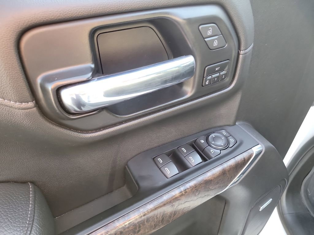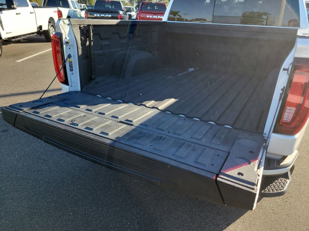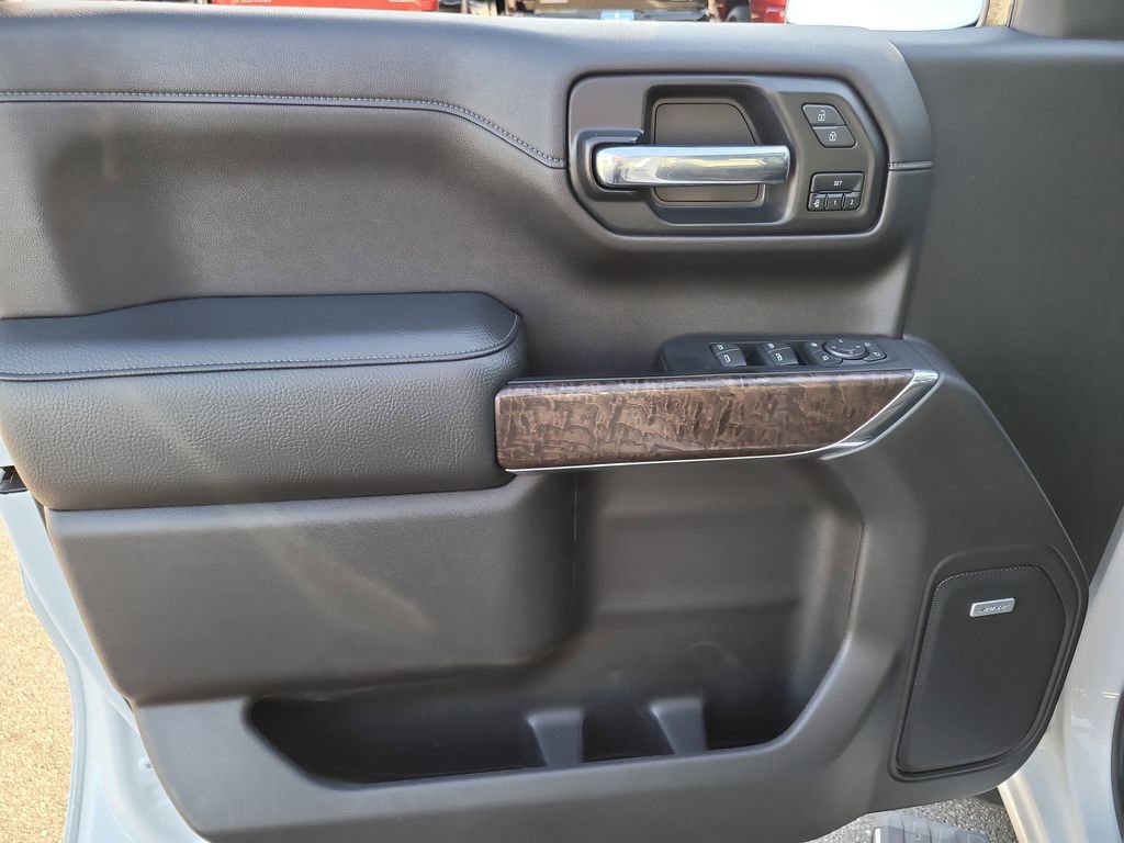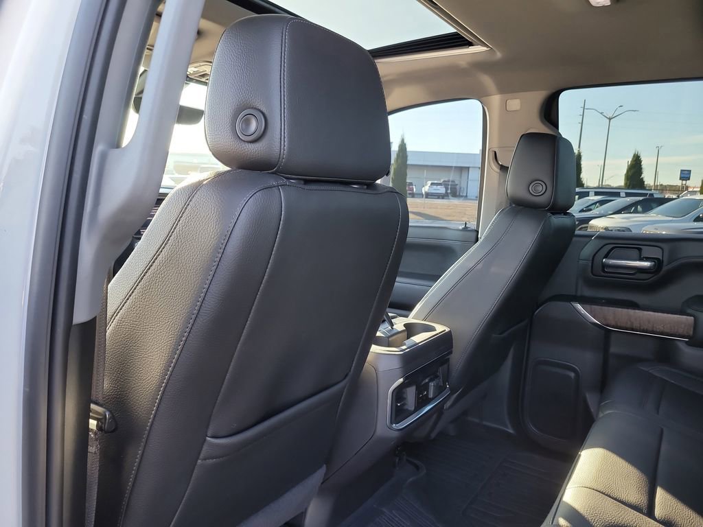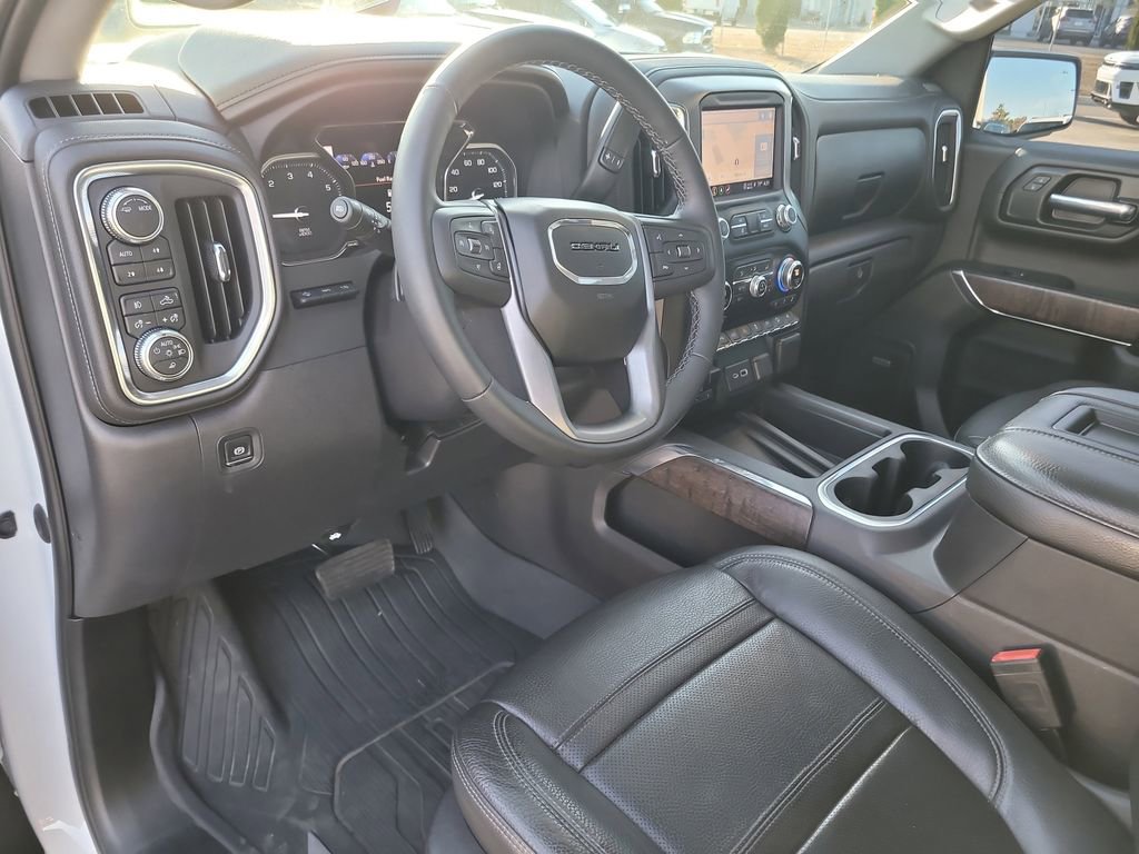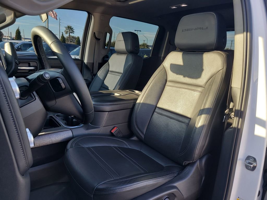 The exterior of this Sierra Denali is finished in a stunning White Frost Tricoat, complemented by the iconic Denali grille and chrome accents. Step inside the cabin and you'll be greeted by a luxurious, well-appointed interior featuring premium leather seating, genuine wood accents, and a host of convenience and comfort features.